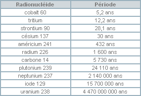 (1) Périodes exprimées en "demi-vies", càd le temps nécessaire pour perdre 50% de la radioactivité.