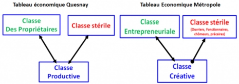 METROPOLE ET LUTTE DES CLASSES : Là encore, il suffit simplement de lire quels sont les objectifs de la métropole : La lecture des documents valorisant les métropoles, insiste sur la nécessité de capter « la classe créative », c’est-à-dire l’ensemble des actifs dont l’activité tourne autour de la « création d’idées », qu’il n’y aurait plus qu’à valoriser, rôle dévolue à la « classe entrepreneuriale », dont le rôle et l’utilité serait de financer en vue de valorisation. Pour y arriver, la Métropole a besoin de la « classe créative », objet de toutes les attentions, d’où les politiques « d’attractivité, et de rénovation urbaine », visant à, les « capter » et à les « fixer ». Observons dans ce cadre, que la métropole réintroduit le concept de « classes sociales », car si la « classe créative » est reconnue en tant qu’acteur majeur, au côté de la « classe entrepreneuriale », il existe de fait, à côté, une autre classe qui habite la métropole ou plutôt ses « appendices périphériques », dénommés ici « territoires » [8], traité comme « variable d’ajustement » du système métropolitain, et pourtant indispensable au fonctionnement global. Cette question d’analyse en termes de « classes sociales », renvoie à notre histoire économique et la première analyse effectuée par Quesnay, qui ne voyait chez les « paysans producteurs » que la seule « classe productive », comme aujourd’hui, les « politiques métropolitaines » ne reconnaissent que la « classe créative ». Rappelons qu’à cette époque, la classe complémentaire, s’appelait …. la « classe stérile », constitué notamment des artisans. On peut donc à l’image de Quesnay, et en s’appuyant sur les concepts utilisés, représenter le « tableau économique de la Métropole ». Observons dans ce cadre, que les fonctionnaires sont mis dans la case improductive, ce qui explique tout le discours tenu aujourd’hui (trop nombreux, trop couteux, etc).