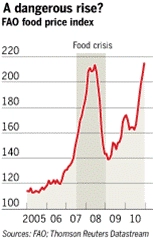 Mais il y a aussi des conséquences indirectes profondes, notamment la hausse des aliments de première nécessité. En raison des températures plus élevées, des pluies abondantes et de la pénurie d"eau, la production de vivres diminue. En même temps, la demande de certains produits alimentaires augmente dans les pays émergents très peuplés, comme l"Inde et la Chine. La combinaison de ces deux facteurs fait monter en flèche les prix, qui atteignent à présent le niveau de 2008, lorsque des émeutes de la faim ont éclaté dans le monde entier. Suite à cette montée des prix de la nourriture, le nombre d’affamés a augmenté de plus de cent millions.[4] Les émeutes qui ont soulevé la Tunisie sont notamment liées à l’augmentation des prix de l’alimentation. Elles pourraient être le signe précurseur d’une série d’émeutes de la faim dans les pays du Sud, comme en 2008.