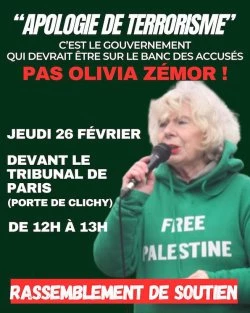 Nous exprimerons pour notre part notre solidarité avec Olivia Zémor en participant, nombreux, à un RASSEMBLEMENT DE SOLIDARITÉ LE JEUDI 26 FEVRIER DE 12H À 13H, DEVANT LE TRIBUNAL DE PARIS de la Porte de Clichy (Métro lignes 13 et 14, RER C)