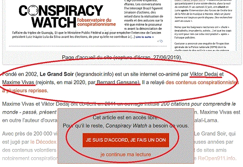 Une question sur les « Fonds Marianne » : est-ce que les animateurs de Conspiracy Watch avaient déjà les sous-sous dans la po-poche et en ont-ils usé pour créer sur moi « une notice » afin d’aller chanter que je suis un nazi et que je nie l’attentat contre les twin towers ? Si oui, j’aurai donc, là aussi, comme pour France Inter, financé mes calomniateurs.