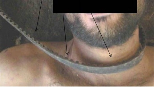 La photo « accablante » nous montre qu’on a conservé la courroie ayant servi à l’étranglement du prisonnier. Pour être certain que le lecteur ne manque pas ce détail important (la courroie), elle a été clairement identifiée « par des flèches efficaces ». On nous la montre nettement (excusez, mais je ne peux difficilement retenir ce fou rire qui m’envahit) ! On sent tout le sérieux dans ce rapport !