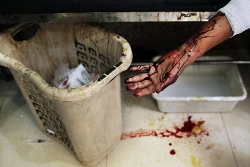 On suggère aux pages 4 et 12 que ces photos ont été prises dans un hôpital militaire (thèse soutenue par Mme Marie-Ève Bédard au bulletin de nouvelle télé à 15 m. 10 sec. du début [9]). C’est là où, dit-on, ces gens auraient été amenés après avoir été torturés jusqu’à la mort. Pourtant, nous voyons tous les corps reposer sur du sable ! Même en Syrie, on peut douter sérieusement que les hôpitaux aient un sol aussi désertique !