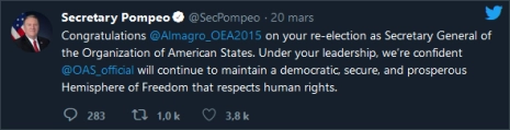 De son côté, le chef de la diplomatie américaine Mike Pompeo a salué la réélection d’Almagro tout en exprimant sa confiance en lui pour « continuer d’œuvrer en faveur de la démocratie, la sécurité et la prospérité du continent dans la liberté et le respect des droits de l’homme ». Tout porte à croire que l’OEA aura bien du mal à se défaire de son image de « ministère des Colonies » des États-Unis.