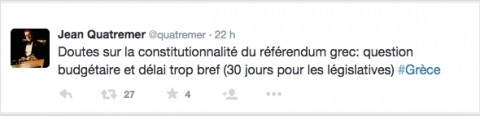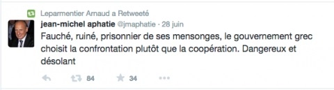 Reprenons. Jean Quatremer (retweeté par Arnaud Leparmentier), Arnaud Leparmentier (retweeté par Jean-Michel Aphatie), et Jean-Michel Aphatie (…) sont d’accord : haro sur le gouvernement grec et sur son projet de référendum ! Et, au cas où les adeptes de Twitter n’auraient pas bien compris le message, ils n’ont pas hésité à le répéter… ad nauseam ?