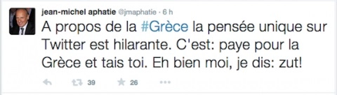 À l’instar de Jean-Michel Aphatie qui, entre deux rendez-vous pour ses transferts de l’intersaison et après avoir découvert la situation en Grèce « dans les JT » (il était temps), s’est immédiatement fait une opinion :