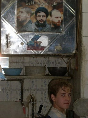 Dans le vieux quartier juif, de nombreuses maisons sont fermées : celles de juifs syriens qui sont allés s’installer en Palestine. Quelqu’un nous dit que ces maisons sont protégées, ici, par une loi qui interdit d’occuper les biens des absents, en attendant un retour possible de leurs propriétaires. Plus loin, devant une petite échoppe de pizzas, je demande au patron si je peux photographier ce qui est affiché en bonne place, à côté du four : la photo de H. Nasrallah. Le jeune pizzaiolo sourit quand je lui propose de rester sur la photo.