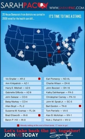 Une députée US, Gabrielle Giffords, a été abattue lors d’un meeting politique qu’elle animait dans la ville de Tucson (Arizona). Attentat qui n’est sans doute pas sans relation avec l’odieuse campagne électorale de Sarah Palin, ex-candidate à la vice-présidence des USA, qui désignait sur la carte ci-jointe les député(e)s à « abattre », c’est-à -dire ceux qui avait voté la loi sur l’établissement d’une sécu aux Etats Unis…Les cibles en rouge représentent les députés qui ne se représentaient pas. Les cibles en blanc les députés à abattre, dont G. Giffords (quatrième sur la liste).