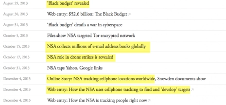 Ce qui est essentiel ici est que la liste des « Mauvaises Révélations de Snowden » établie par Kaplan implique invariablement des histoires publiées non pas par Snowden (ni même par The Intercept ou The Guardian), mais par le New York Times et le Washington Post. Mais à l’instar des éditorialistes du Post, Kaplan est trop lâche pour accuser de trahison les rédacteurs les plus importants du pays de ces deux quotidiens, ou d’aide aux terroristes, ou d’atteinte à la Sécurité nationale, alors il prétend que c’est Snowden, et Snowden seul, qui a fait le choix de révéler ces programmes au public. Si Kaplan et les éditorialistes du Post croient vraiment que toutes ces histoires auraient dû rester secrètes et qu’elles ont mis en danger la sécurité d’individus, pourquoi n’attaquent-ils pas les éditorialistes et les journaux qui ont pris la décision de les révéler ? Snowden lui-même n’a jamais divulgué publiquement un seul document, de sorte que tous les programmes qui ont été révélés l’ont été par décision d’organes de presse.