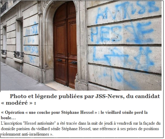 Mais là , franchement… C’est Stéphane Hessel ! C’est le mec qui puait le plus (non pas des aisselles mais de ses doigts inquisiteurs à l’égard des juifs d’Israël). Ce papi qui dénonçait la présence de juif en Israël (la Palestine devrait être purifiée de ses juifs), auteur de « Indignez-vous ! », est mort dans la nuit de mardi à mercredi à l’âge de 95 ans. Il faut croire que ce faussaire de l’histoire a fait son temps…. / l’apôtre de l’indignation à 3€10 avait repris, il y a peu, son bâton de pèlerin pour diaboliser, comme à sa sacre sainte habitude, Israël, dans son dernier livre « Le rescapé et l’exilé » co-écrit avec son grand ami et diplomate palestinien, Elias Sambar…. / espérons que l’odeur de mort qui l’entoure ne va pas étouffer la France sous une nouvelle vague d’Indignation sélective. (Par Avi Retschild" - JSSNews-). (1)