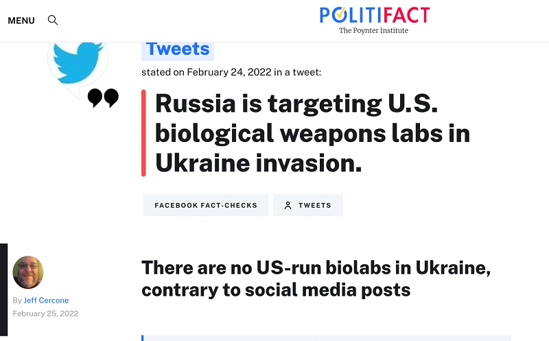 Les "vérificateurs de faits" autoproclamés de la presse commerciale américaine ont passé deux semaines à qualifier de désinformation et de fausse théorie du complot l’affirmation selon laquelle l’Ukraine disposerait de laboratoires d’armes biologiques, seule ou avec le soutien des États-Unis. Ils n’ont jamais présenté de preuves à l’appui - comment pouvaient-ils le savoir ? et comment pouvaient-ils prouver le contraire ? - mais ils l’ont néanmoins affirmé avec le ton d’autorité et d’assurance qui les caractérise, ainsi que leur droit autoproclamé de décréter la vérité, en qualifiant définitivement ces affirmations de fausses.