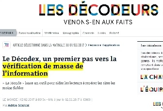 Annonce de la création du Décodex : « De quoi s’agit-il [...] ? D’un outil pour vous aider à vérifier les informations qui circulent sur Internet et dénicher les rumeurs, exagérations ou déformations…. Fruit de plus d’un an de travail, le Décodex, lancé début février 2017 par Le Monde, est un outil qui vise à lutter contre la diffusion virale de fausses informations… ».