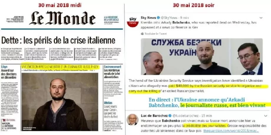 Cela dit, le Monde (« Fais ce que je dis, pas ce que je fais ») saute à pieds joints dans une flaque de sang fictive : « Le journaliste russe Arkadi Babtchenko, critique virulent de Poutine, assassiné en Ukraine ».