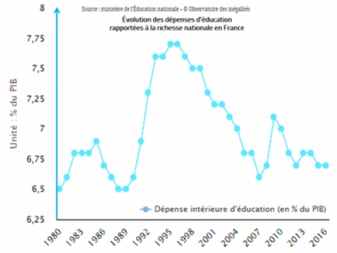 Est-ce que les moyens financiers sont mis en proportion de l’objectif ? Le graphique visualise une baisse conséquente des moyens financiers décidés par les gouvernements successifs. Au-delà du graphique certaines analyses doivent être lues : « La dépense intérieure d’éducation rapportée à la richesse de notre pays a baissé de 7,7 % à 6,7 % entre 1996 et 2016. Cela veut dire que chaque année, notre pays consacre une part moindre de sa richesse à la formation de sa jeunesse. Et un point de PIB, c’est énorme : si l’on consacrait le même niveau à l’éducation qu’en 1996, notre système d’enseignement disposerait de 23 milliards d’euros de plus, à peu de chose près, l’équivalent de l’ensemble du budget de l’enseignement supérieur. Avec cet argent, on pourrait doubler les moyens de l’enseignement supérieur mais aussi de la recherche française, et tout cela à la fois ! Ou alors augmenter de 50 % les moyens du primaire et du secondaire : de quoi dédoubler toutes les classes de la maternelle au primaire. On peut certainement dépenser mieux pour l’école, mais il faudrait être aveugle pour ne pas comprendre qu’il faut aussi se donner les moyens d’investir. » [11]