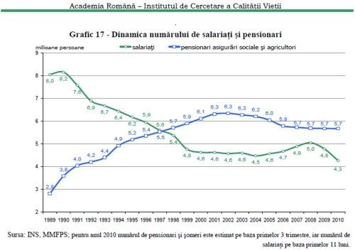 Selon des données de l’Institut d’Investigation de la Qualité de Vie de l’Académie Roumaine (ICCV) en 1989 il existait 8 millions de salariés en Roumanie et 2,8 millions de retraités. Depuis le coup d’état de décembre 1989 la situation a beaucoup changé, jusqu’à la situation de 2010 où les salarié était 4,3 millions (en 2011 il est encore plus bas à 4,095 millions) et les retraités 5,7 millions.