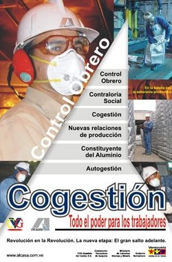 Dans l’immense manufacture d’aluminium ALCASA qui est propriété de l’Etat et où l’expérience la plus avant-gardiste de ce que l’on appelle "la cogestion" est mise en place. Il est assez clair que pour les travailleurs le mot "cogestion" signifie précisément le contrôle et le management par les travailleurs. De ce fait, une affiche imprimée par ALCASA met en avant le "contrôle ouvrier" comme slogan principal (voir l’illustration ci-dessous).