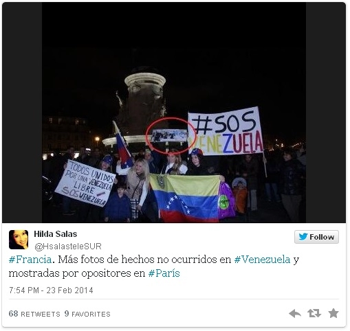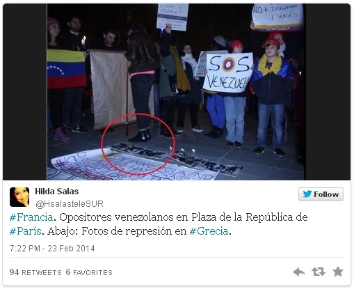 La correspondante [Hilda Salas] a signalé que la majorité des potos qui figuraient sur les pancartes [des opposants présents lors du rassemblement qui s’est tenu Place de la Bastille à Paris le samedi 22 février] correspondaient à des faits qui n’ont pas lieu au Venezuela, puisqu’il saute aux yeux très clairement qu’il s’agit de photos réelles mais prises en Egypte, au Chili, au Pérou et en Grèce.