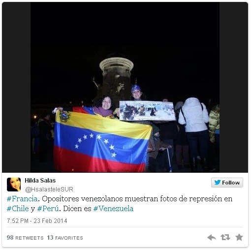 Cette information nous a été rapportée par la correspondante de Telesur en France, Hilda Salas, qui a diffusé à travers son compte Twitter @HsalasteleSUR des photos qui étaient utilisées par des opposants vénézuélienslors d’une manifestation dans la capitale française.