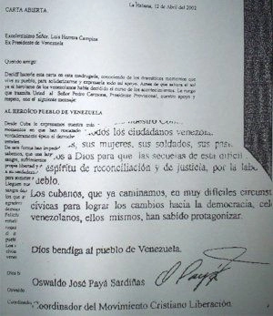 Le dirigeant du Mouvement Chrétien de Libération Osvaldo Payá Sardiñas a transmis un communiqué téléphonique au « Puente Informativo Cuba Miami », le matin du 11 avril 2002, en s’adressant au peuple vénézuélien pour soutenir le coup d’Etat qui venait de se produire dans ce pays.