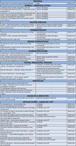 Voici un récapitulatif des articles publiés sur le site internet du Monde (http://www.lemonde.fr/) durant les jours qui ont suivi la mort de Fidel Castro, jusqu’au 29 novembre (date de la publication de l’article de l’envoyée spéciale du journal à Cuba, Annick Cojean), classés par catégorie.