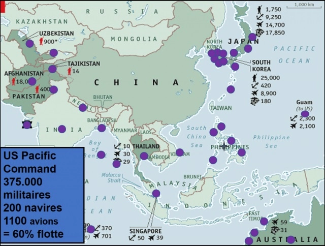 Un rapport récent cite quatre pays qui sont les cibles potentielles d’une action militaire : l’Iran, la Russie, la Corée du Nord et la Chine (34). En dépit des roulements de tambour face à la Corée du Nord et de la rhétorique sur la Russie et l’Iran, c’est aujourd’hui en premier lieu la Chine qui est au centre du viseur. Tout autour de ce pays les Etats-Unis ont plus de trente bases militaires, points d’appui ou centres d’entraînement (petites boules sur la carte). D’ici 2020, 60% du total de la flotte sera stationnée dans la région (35). Vu sur une carte, il n‘est pas exagéré de dire que la Chine est cernée ou encerclée.
