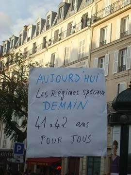 En ne demandant pas le retrait pur et simple de cette la réforme, et en faisant ainsi porter la négociation simplement sur une de ses conséquences, Bernard Thibault fait le boulot de Sarkozy et lui ouvre donc la route pour la suite de la casse, sachant, au moment où l’ on parle de plus en plus de faire passer la durée du travail de 40 à 41 ans pour tous, que les buts de cette réforme ne sont pas que les seuls bénéficiaires des régimes spéciaux (qui représenteront seulement 1,62 % du montant total des retraites dans 20 ans) , mais que c’ est en fait TOUS les salariés qui d’ une manière ou d’ une autre, à plus ou moins long terme, seront la cible de Sarkozy, comme l’ a dit Raymond Soubie, le conseiller social de Sarkozy « c’ est la plus difficile des réformes, puisqu’ elle concerne ceux qui ont le pouvoir de blocage le plus fort . Si elle réussit, le reste suivra. » (Les Echos 1er nov. 07).