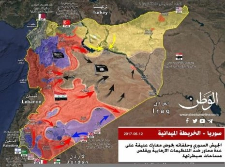 Le mouvement étatsunien sur al-Tanf a été couvert par une attaque des forces par procuration de l’armée américaine au sud-ouest de la Syrie. Un grand groupe de « rebelles », qui comprend des éléments d’al-Qaïda et qui est ravitaillé depuis la Jordanie, a fait mouvement pour prendre la ville de Deraa aux mains du gouvernement syrien. On espérait que cette attaque détournerait les forces syriennes de leur mouvement vers l’est. Mais malgré les attaques suicides, l’assaut contre Deraa n’a pas réussi à faire reculer les fortes défenses des forces syriennes. La tentative de diversion a échoué. La position syrienne à Deraa a été renforcée par des unités de Damas qui attaquent maintenant les gangs de mercenaires de l’armée américaine. Des progrès significatifs ont été réalisés aujourd’hui dans la banlieue sud de Deraa, et l’armée syrienne va probablement poursuivre son offensive jusqu’à la frontière jordanienne.