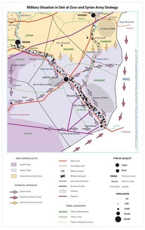 Selon ce plan, l’armée syrienne avancera sur Deir Ezzor à partir du nord-ouest le long de la rive sud de l’Euphrate et à partir du sud-ouest à travers le semi-désert syrien. Après avoir libéré Deir Ezzor, l’armée syrienne traversera l’Euphrate et continuera d’avancer sur les deux rives du fleuve jusqu’à la frontière irakienne pour libérer toutes les zones sous le contrôle de l’EI. La traversée de l’Euphrate nécessitera un important soutien russe.