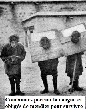 Et le sort des humains n’est pas plus enviable. La grande masse de la population était soumise à l’arbitraire des aristocrates et les moines de haut rang, détenteurs des pouvoir économique, politique et judiciaire. Même le nazi Harrer, à qui on a pourtant appris que la sensibilité était un sentiment honteux, ne peut s’empêcher de faire les constatations suivantes : « ‘Le châtiment infligé aux bandits est particulièrement horrible ; on leur coupe les bras’ ou bien ‘les mains et les pieds’ (…) Puis le ‘moignon est trempé dans du beurre en ébullition.’ Pour l’ ‘adultère’, on applique des ‘châtiments tout à fait drastiques’, par exemple on ‘coupe le nez’ de la délinquante. Harrer raconte encore qu’il eut des ‘sueurs froides’ quand il rencontra un homme qui avait reçu ‘deux cents coups de fouet’ et qui depuis lors devait ‘à vie porter les fers aux chevilles’ » (p. 204). Ettinger note que ces passages ont été sucrés dans l’édition française du récit de Harrer parue sous le titre Sept ans d’aventure au Tibet…