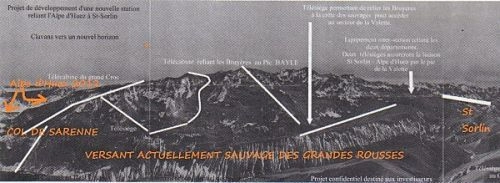 Quelques temps plus tard, Isère Nature s’était procuré un document « confidentiel » circulant entre les mains des investisseurs : on y apprenait que derrière l’implantation immobilière à Clavans, beaucoup avaient des idées derrière la tête. En effet, Clavans est un point stratégique qui permettrait à l’Alpe d’Huez d’étendre de façon considérable son domaine skiable pour le relier une station de la vallée de l’Arves, située à l’autre extrémité du massif des Grandes Rousses : Saint Sorlin. De la sorte, l’Alpe d’Huez ne serait plus une simple station, mais une station-massif.