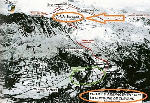 En 2005, l’ adjoint au maire de Clavans tombe de haut en découvrant par hasard « un document établi par le maire dont il ne [lui] avait jamais parlé ! » Il s’agissait ni plus ni moins d’un projet de téléphérique reliant Clavans au Col de Sarenne. Projet qui fut exposé, par la suite, au conseil municipal du village : vaste programme immobilier (3000 lits) assorti de l’aménagement en domaine skiable des pentes de Sarenne.