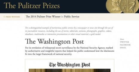 En faisant valoir qu’il n’y avait aucun intérêt public à révéler le programme PRISM, les éditorialistes du Post on oublié de mentionner un détail. Que le journal (en même temps que The Guardian) qui a choisi de révéler le programme PRISM en étalant ses détails opérationnels et le manuel top-secret en première page s’appelle... le Washington Post. Puis, après avoir choisi de le faire, ils ont explicitement vanté leur révélation du programme PRISM (ainsi que d’autres révélations) lorsqu’ils ont postulé pour le prix Pulitzer.
