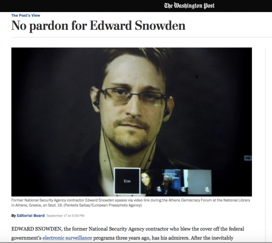 Mais pas le Washington Post. Face à une campagne grandissante menée par l’ACLU [Organisation de défense des droits civiques aux Etats-Unis - NdT] et Amnesty pour obtenir un pardon pour Snowden, en coordination avec la sortie ce week-end du biopic d’Oliver Stone, ’Snowden,’ l’éditorial du Post aujourd’hui s’est non seulement prononcé contre un pardon, mais a explicitement demandé que Snowden - la propre source du journal – soit poursuivi pour espionnage ou, comme « solution de rechange », qu’il accepte « une mesure de responsabilité pénale pour ses excès et que le gouvernement des États-Unis offre une mesure de clémence. »
