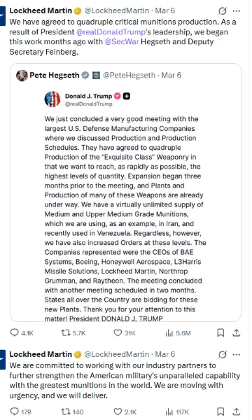 Ce qui a déclenché ma réflexion, c’est la révélation de Lockheed Martin : l’entreprise avait reçu pour instruction de Trump, des mois avant l’attaque contre l’Iran, d’augmenter massivement la production de missiles intercepteurs, avec pour objectif à court terme de quadrupler la capacité du THAAD. En janvier, avant même le début du conflit actuel, Fox News faisait déjà état de divers accords, notamment un triplement des livraisons d’intercepteurs PAC3 MSE, finalisé entre Lockheed et le Département de la Guerre.