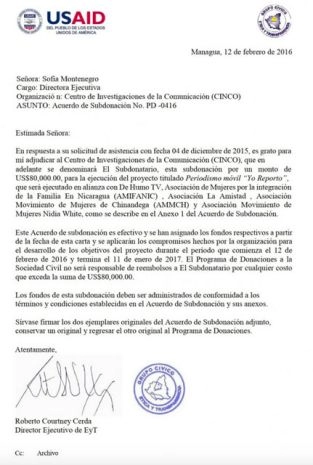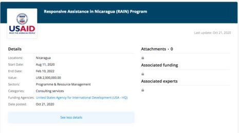 USAID : 4 740 000 dollars le 23 février 2017 au projet Voces para Todos ; 2 071 639 dollars le 2 mai 2017 à Voces Vitales Nicaragua ; 1 750 000 dollars le 17 juillet 2017 à Mujer, Voz Vital para el País (Femmes, voix vitales pour le pays) ; 100 000 dollars, le 4 mai 2018 au Movimiento Puente (Mouvement Pont) ; 643 214 dollars le 23 mai 2018 pour un projet Création de plateformes ; etc. Mis en œuvre de 2010 à 2020, destiné à favoriser la contestation des projets d’infrastructure du gouvernement, le Programme de gouvernance municipale a lui reçu la coquette somme de 29,99 millions d’euros.