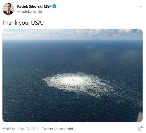 Radosław Sikorski est un ancien ministre de la défense et ministre des affaires étrangères de la Pologne. Il est aujourd’hui membre du Parlement européen. Hier, il a posté une photo du gaz s’échappant des pipelines Nord Stream endommagés et a remercié les États-Unis de les avoir fait sauter.