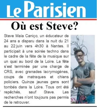 Le jeune Steve Maia Caniço aussi, a disparu. C’était la nuit de la Fête de la musique. Probablement noyé lors d’une charge de police. C’est terrible le « probablement noyé », mais c’est émotionnellement inexploitable à cause de ce qui suit : « lors d’une charge de police ».