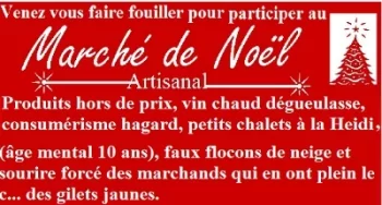 Un gilet jaune, la main arrachée, faisait la queue pour passer à la fouille et au détecteur de métaux à l’entrée d’un marché de Noël vegan afin d’aller boire un horrible vin chaud hors de prix (et dont le goût de piquette était masqué par un excès de cannelle), servi par la mère Macron (non maquillée) dans un faux chalet à l’enseigne de « NOËL.LE ! Vin.e chaud.e pour tous/tes » par un CRS qui le touillait avec le canon de son flash-ball.