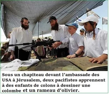 Soit (mais ça me dégoûte) : « Israël a le droit de se défendre et de protéger (par une barrière de sécurité) ses implantations sur la terre que Dieu lui a donnée et que lui disputent des émeutiers terroristes arabes qui refusent de négocier et qui envoient les femmes et les enfants attaquer Tsahal, l’armée la plus morale du monde. Plusieurs dizaines d’assaillants ont trouvé la mort lors des affrontements » (1).