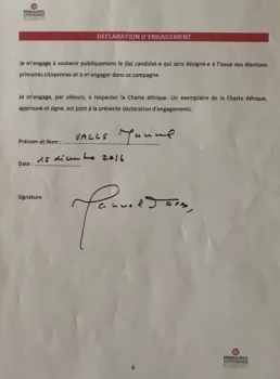 Voyez, ci contre, l’engagement signé par Manuel Valls et observez ce qu’il fait, si peu après.