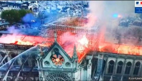 Cathédrale suppliciée. Un symbole détruit, Macron y est allé faire son cinéma, le cœur martyr de la Capitale prisonnier des flammes, spectacle d’épouvante, putain tout le monde est catho, maintenant, injustifiable malheur, ça m’en touche une sans faire bouger l’autre, cruelle injustice, notre destin profond réduit en cendre, ma voisine fait les poubelles pour trouver à manger, sans le toit de N-D Paris n’est plus Paris, ce sont des ouvriers Gilets jaunes qui rebâtiront pas les costumés pleureurs, spiritualité, au-delà des croyances, peine incommensurable, on aurait dit un bûcher de l’Inquisition, union nationale, communion de toute une nation, et Dieu qui ne s’est pas sorti les doigts du cul pendant que la flèche tombait, âme, affliction, jour funeste, la France en deuil, je reprends deux fois des moules, Notre-Dame c’est notre histoire qui brûle ! Vos gueules, merde, j’entends plus les pauvres crier sous les matraques !