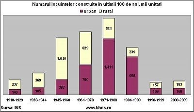 Officiellement le nombre de logement existant en Roumanie est de 8,4 millions dont 4,5 en zone urbaine et 3,8 millions en zone rurale. Approximativement la moitié des habitations existantes furent construite durant le gouvernement de CeauÅŸescu. C’est à dire qu’entre 1965 et 1989 ont été construites 2,8 millions de logement dans les villes et 1,2 millions en zone rurale à un rythme annuel de 160 000.