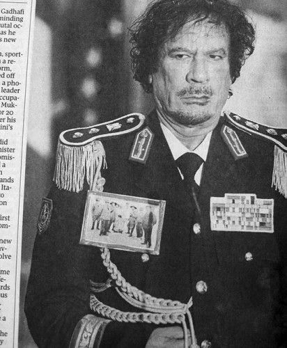 Kadhafi, en visite officielle en Italie, porte la photo épinglée sur sa veste.