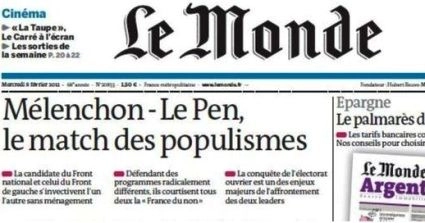 … Et Le Monde n’avait pas hésité à transformer sa titraille en éditorial : « Mélenchon-Le Pen, le match des populismes » (8 février 2012).