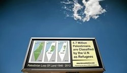 Des affiches présentent une série de cartes montrant le rétrécissement du territoire de la Palestine à la suite de l’extension de la colonisation israélienne. La légende « Perte de territoire de la Palestine entre 1946 et 2010 » est inscrite en grands caractères sous la carte ; avec le message suivant « 4,7 millions de Palestiniens sont répertoriés comme réfugiés par les Nations unies »