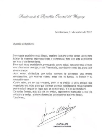 Le président de l’Uruguay José « Pepe » Mujica a également manifesté sa solidarité par une lettre très personnelle : « J’ai du mal à écrire ces lignes, je préfère t’appeler par téléphone comme nous le faisons si souvent pour parler des préoccupations et des espérances de ce continent si riche et si exigeant.
