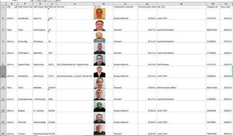 En regardant l’un des fichiers détourné, nous avons trouvé les informations personnelles de 58 citoyens ukrainiens travaillant pour Britam Defense Ltd en Irak. Plusieurs employés pourraient ne pas figurer sur la liste car le « folder/Irak/People » contient les photocopies des passeports de plusieurs autres Ukrainiens. Il y a aussi des Serbes/Croates et des Géorgiens dans la liste qui pourraient être également filmés pour des « Russes ».