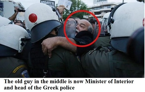 Son supérieur direct, ministre de l’intérieur, sera Nikos Voutsis cadre de Syriza expérimenté et pugnace qui a déjà eu maille à partir avec la police lors de nombreuses manifestation comme dans le cliché ci-dessous retweeté à foison. Le fait que le fils de Voutsis est un anarchiste revendiqué qui vient de sortir de prison rajoute du piment à la situation.