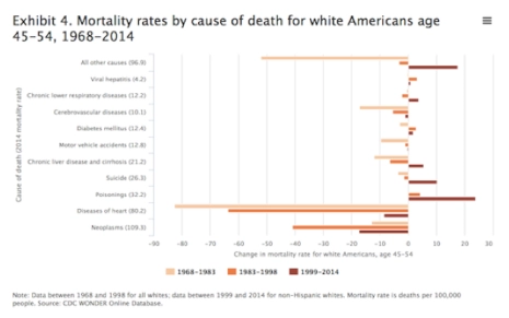 Voici un an, Anna Case et Angus Deaton, économistes à l’Université de Princeton, ont publié une étude aux résultats saisissants ; depuis 1999, le taux de mortalité chez les Étasuniens blancs âgés de 45 à 54 ans est en augmentation constante. Le constat est pire encore quand on sait que dans le même temps le taux de mortalité était en diminution pour la population dans son ensemble.