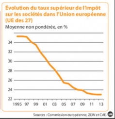 LE MOINS DISANT FISCAL : Dans le cadre du « marché libre et non faussé », imposé par le libéralisme, la concurrence fiscale entre Pays a débouché sur une baisse permanente du taux d’imposition des groupes industriels, au nom de la compétitivité et de l’emploi. Les seuls résultats effectifs de cette politique de marché, ont été la chute des rentrées fiscales, la baisse des services publics, et la hausse du chômage de masse et des précarités sociales (salaires, empois, logements, santé) poussant les Etats au devoir des solidarité (R.M.I, R.S.A etc.), donc de besoins de financement, opérés sur les ménages (Impôt sur le revenu et T.V.A).